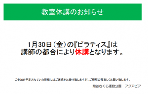 - 1月30日(金)『ピラティス』休講のお知らせ