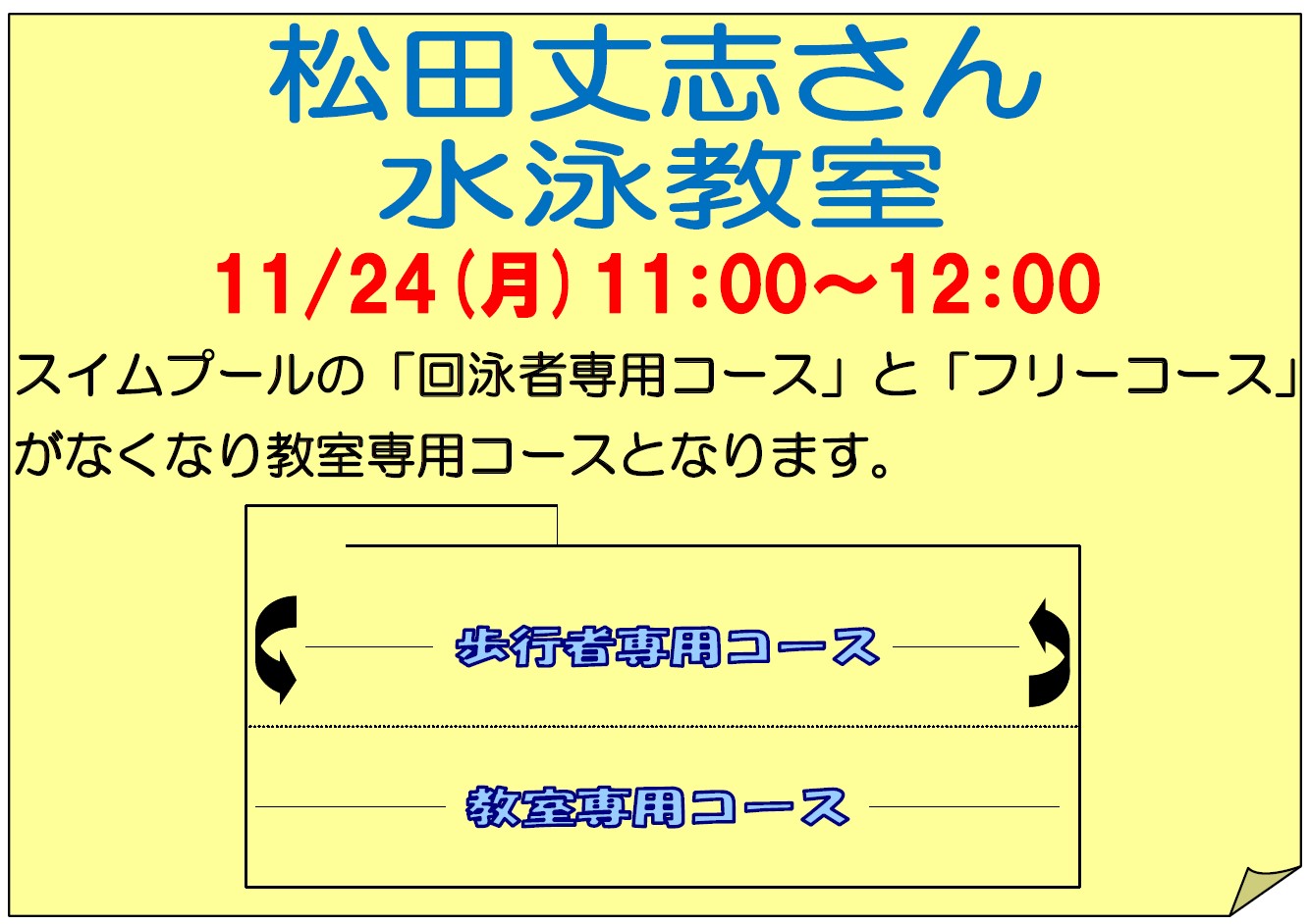 11/24(月・祝)開催予定の「元競泳日本代表 松田丈志さんが教える 水泳教室」に伴い、以下の内容でコース変更いたします。